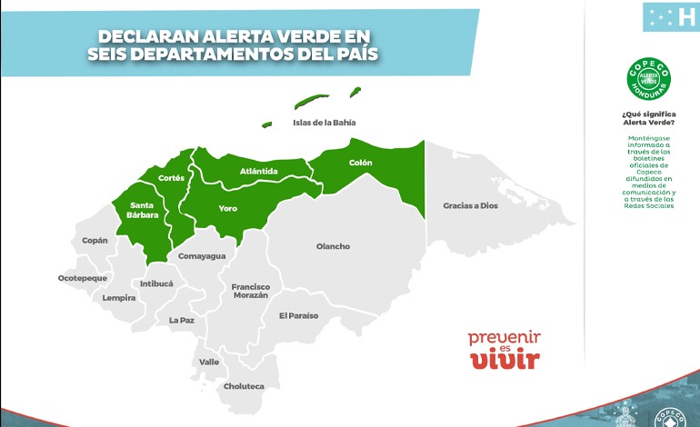 La Secretaría de Estado en los Despachos de Gestión de Riesgos y Contingencias Nacionales, declara alerta verde para seis departamentos del país por el ingreso de un frente frío, que generará lluvias en el país, con montos de hasta 160 milímetros (mm), en las montañas del norte y noroccidente.