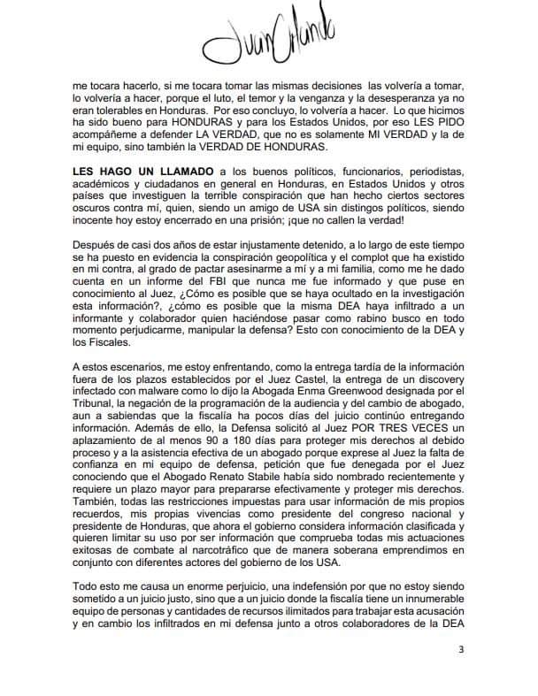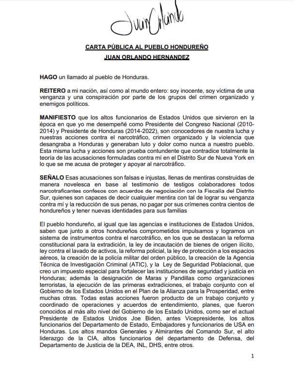Quizás anticipando lo desesperado de su situación, el expresidente hondureño envió este lunes una carta a sus seguidores, publicada por su esposa en redes sociales, en la que asegura que las acusaciones en su contra son «falsas e injustas», y que se basan en el testimonio de «narcotraficantes confesos».