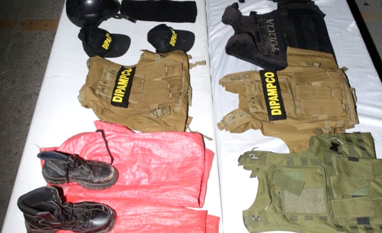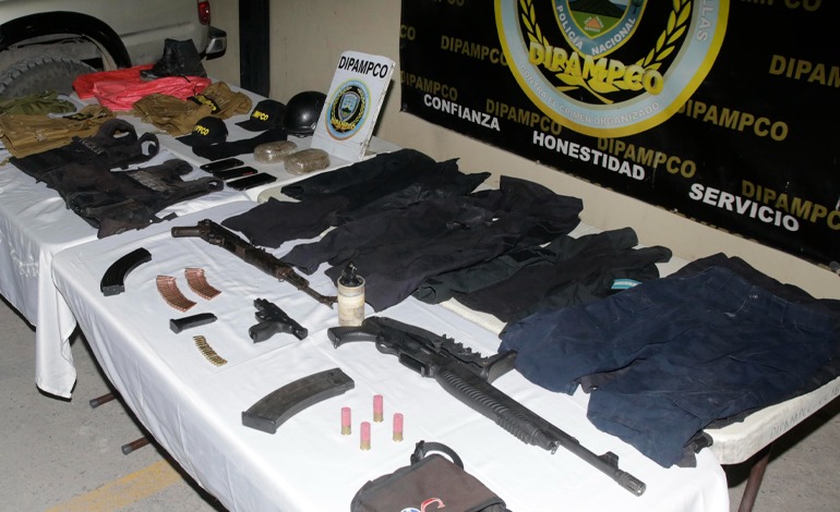 En el lugar se les dio captura a dos miembros activos de esta estructura criminal identificados como Kevin Rigoberto García Ilobares, de 38 años y Cristhian Fernando Hernández Rivera, de 28 años, a quienes se les decomiso varios uniformes con sus respectivas fatigas, algunos chalecos antibalas, gorras, pasamontañas, un casco y un par de botas.