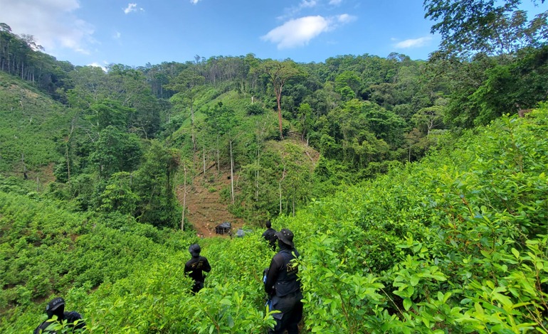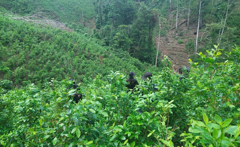 COLÓN. – Mediante actividades Inteligencia y reconocimiento por parte de equipos especializados de la Dirección Nacional Policial Antidrogas (DNPA) con apoyo de la Dirección Nacional de Fuerzas Especiales (DNFE-COE) y en coordinación con la Fiscalía Especial Contra el Crimen Organizado (FESCCO) de San Pedro Sula, Cortés se ha logrado ubicar y asegurar una extensa plantación de arbustos de supuesta hoja de coca, dos viveros y un laboratorio rústico en la zona atlántica del país.