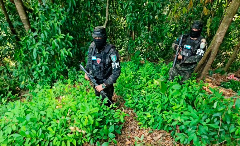 Semana tras semana las fuerzas de seguridad del Estado reportan aseguramientos de plantaciones de coca, el más reciente el pasado sábado 11 de mayo, en la montaña La Gigante, Limón, departamento de Colón, zona del Caribe hondureño.