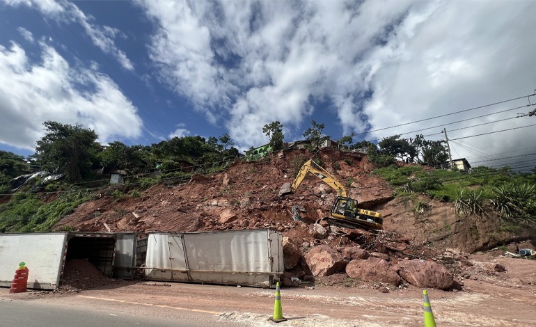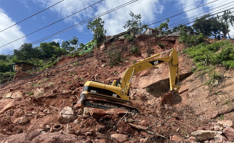 La maquinaria realiza actividades de remoción y levantamiento del material suelto, donde la primera etapa consiste en atender la emergencia para asegurar el sitio la construcción de una barrera con roca al pie del talud y el retiro de los contenedores que habían sido colocados de manera temporal para evitar que los desechos ocuparan toda la calle.