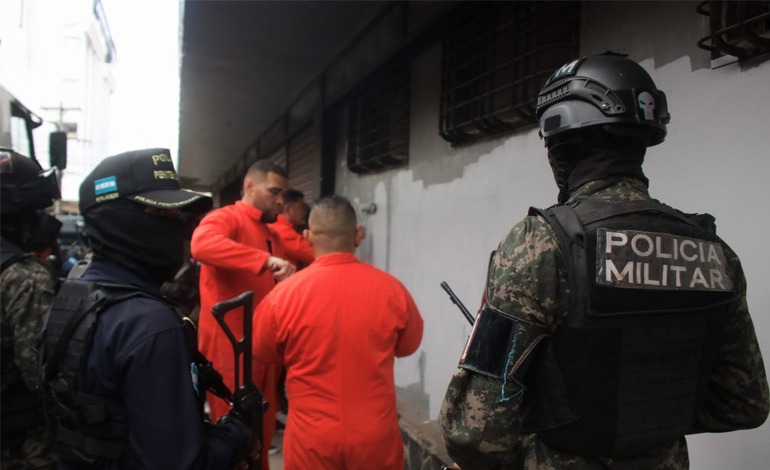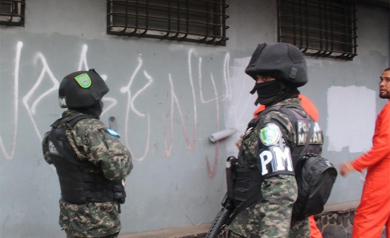 Vistiendo overoles anaranjados, con sus cabezas rapadas algunos de ellos con los tatuajes que los identifican con su grupo delincuencial, grilletes en sus pies y un rodo en sus manos, los internos cubrieron con pintura gris, cada uno de los grafitis pintados en paredes de edificios ubicados en distintos sectores de Comayagüela.