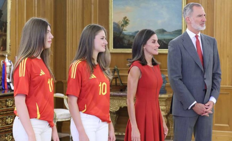 En la escalinata del palacio de la Zarzuela, el equipo posó con la familia real. La reina Letizia vestía de rojo, y la princesa Leonor y la infanta Sofía llevaban la camiseta de la selección con el dorsal 10.