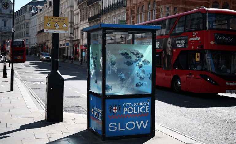 El popular y cotizado grafitero Banksy transformó el domingo una cabina policial de Londres en un verdadero acuario con peces que parecen pirañas, completando una semana con motivos animales diarios en las calles de la capital británica.