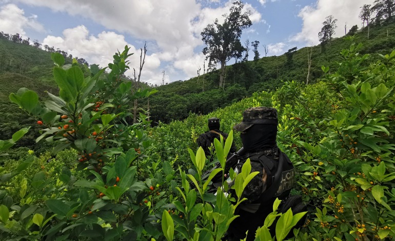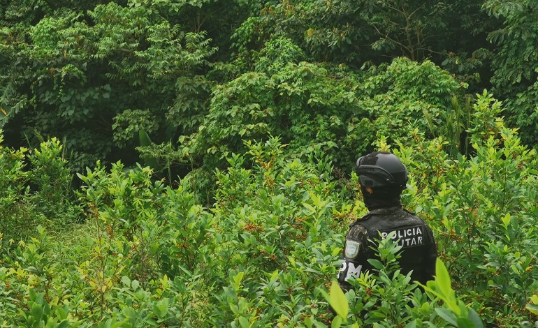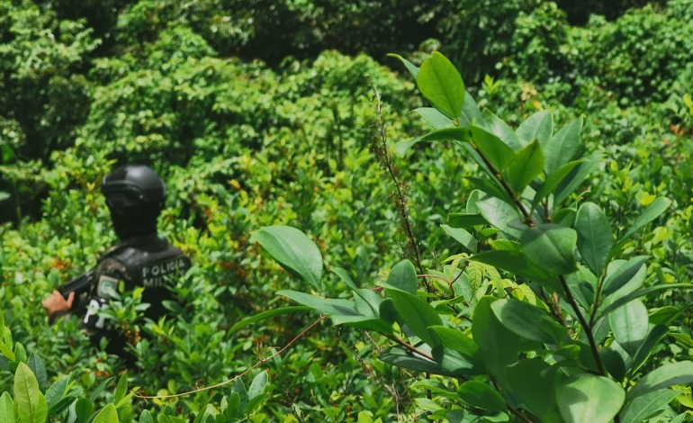 Producto de la intensificación de operaciones en el combate al narcotráfico, las Fuerzas Armadas a través de equipos de operaciones especiales de la Policía Militar del Orden Público y la Dirección de Información Estratégica en coordinación con el Ministerio Público, localizó y aseguró una nueva plantación con arbustos de hoja de coca, con una extensión de 15 manzanas de tierra, contabilizando 154,500 arbustos, con una altura variable entre 1.60 a 2.0 metros