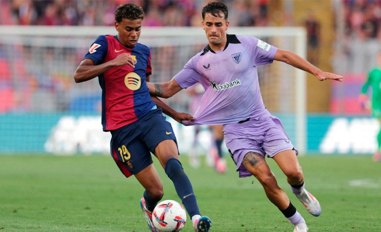 Con un juego colectivo convincente en el segundo partido oficial de su nuevo entrenador alemán Hansi Flick, el club catalán abrió el marcador por medio de su prodigio Lamine Yamal, cuyo disparo con la zurda desde fuera del área fue desviado por la cabeza de Iñigo Lekue (24), aunque Sancet había empatado de penal decretado por el VAR sobre Álex Berenguer (42).