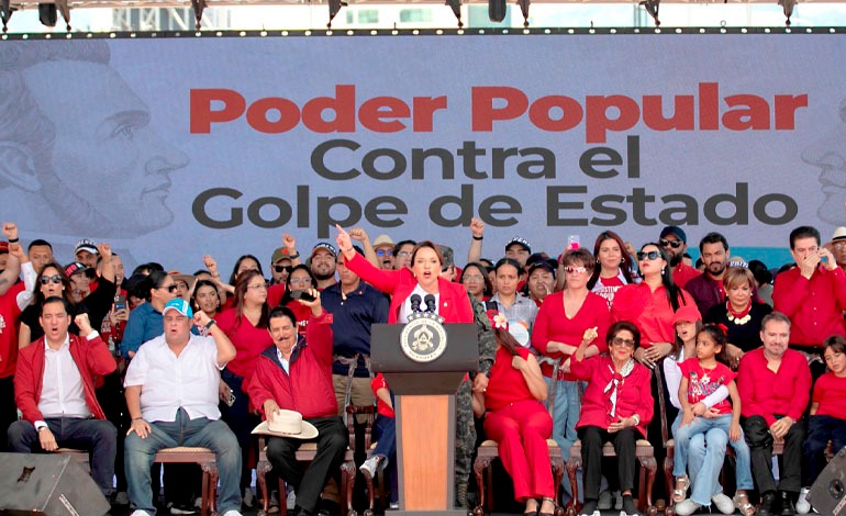 En un ambiente cargado de fervor de izquierda, banderas rojinegras, mantas con el símbolo de la hoz y el martillo, banderas rusas, la presidenta Xiomara Castro enfatizó que “están al mando y volverán a vencer” y atacó al bipartidismo de los partidos Liberal y Nacional por su alianza por el control del Consejo Nacional Electoral, durante la concentración realizada frente a la Casa Presidencial donde seguidores del oficialista partido Libre llegaron de todo el país.