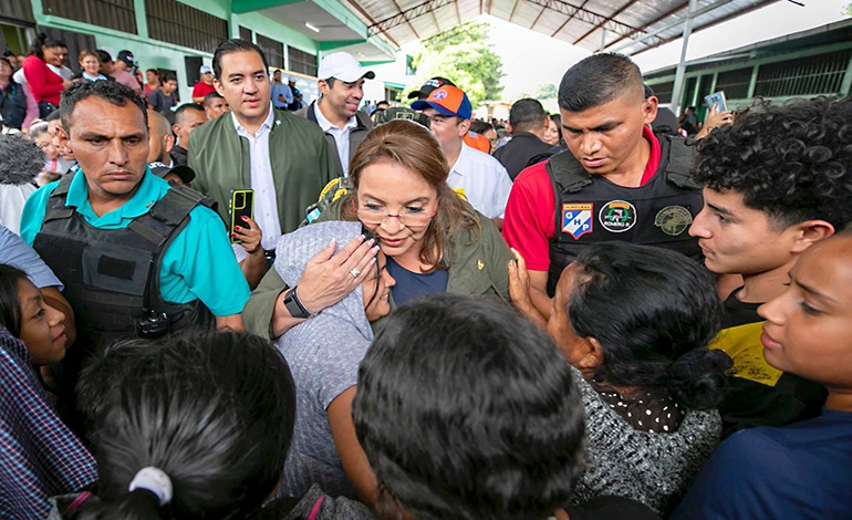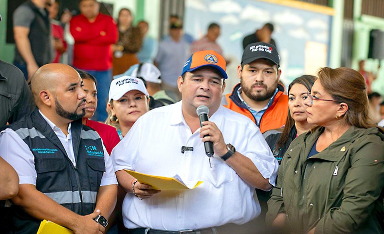 La gobernante estuvo en el macro-albergue instalado en el Centro de Educación Básico- ubicado en la colonia Alemán- acompañada del secretario privado Héctor Manuel Zelaya; el ministro de Educación Daniel Sponda; el titular de la Secretaría de Gestión de Riesgos y Contingencias Nacionales (Copeco), José Jorge Fortín y el alcalde capitalino Jorge Aldana.