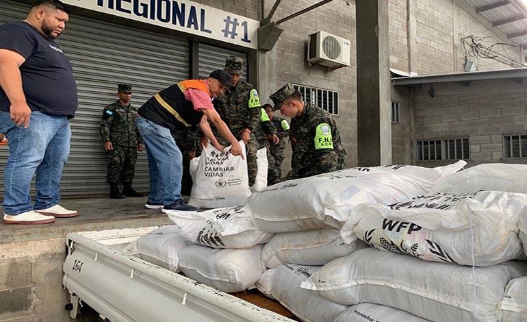 la Fuerza Ejército, fortalecen el apoyo al Comité Permanente de Contingencias (Copeco) con la carga y descarga de alimentos que serán distribuidos a los ciudadanos afectados por la tormenta tropical Sara.
