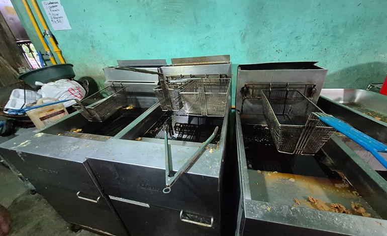 Además, se observó el uso de aceite oxidado en las freidoras y condiciones insalubres en la cocina, como cables eléctricos expuestos, paredes sucias y un piso húmedo y grasoso.