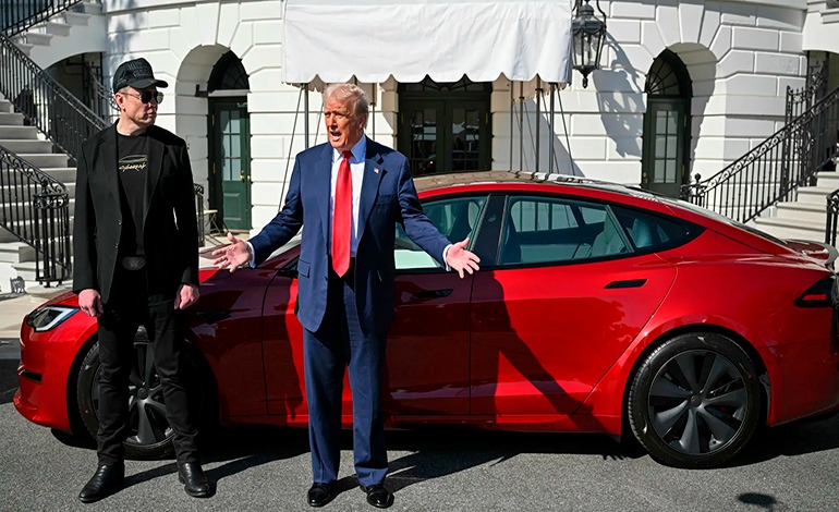 El presidente estadounidense, Donald Trump, convirtió brevemente la Casa Blanca en una sala de exposiciones de Tesla y dijo que comprará un vehículo de la marca de automóviles eléctricos, muestra de un apoyo sin precedentes al propietario y su asesor, Elon Musk.