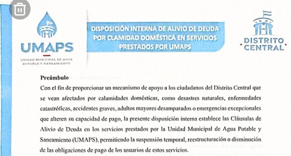 Tegucigalpa. Con el objetivo de brindar apoyo a los ciudadanos del Distrito Central que enfrentan situaciones de calamidad doméstica, la Unidad Municipal de Agua Potable y Saneamiento (UMAPS) aprobó una medida de alivio de deuda para usuarios con obligaciones pendientes en los servicios de agua potable y saneamiento.