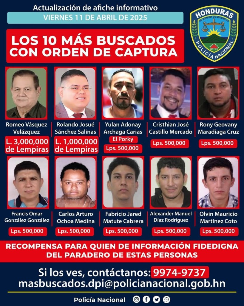 Según información oficial, la recompensa por la captura de Vásquez Velásquez se ha incrementado significativamente, a 3 millones de lempiras.