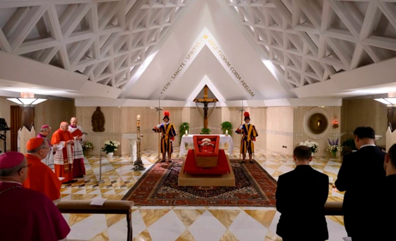 Los restos mortales de Jorge Mario Bergoglio reposan por ahora en la capilla de la residencia de Santa Marta, donde falleció el lunes a los 88 años por un ictus casi un mes después de salir de una larga hospitalización por problemas respiratorios.