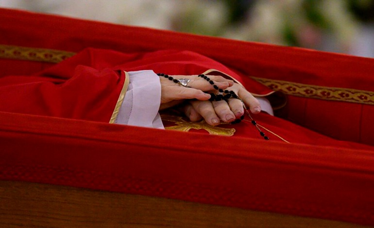 Su cuerpo yace ahora dentro de su féretro, ataviado con una casulla roja y mitra blanca, un rosario entre las manos y escoltado por dos guardias suizos, según las primeras imágenes oficiales tomadas el lunes y difundidas este martes.