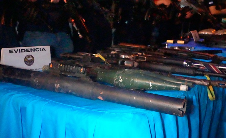 Un lanzagranadas con dos ojivas de lanzamiento antitanque, tres armas de fuego tipo escopeta, tres armas de fuego tipo fusil, tres tipos pistola, de diferentes calibres.