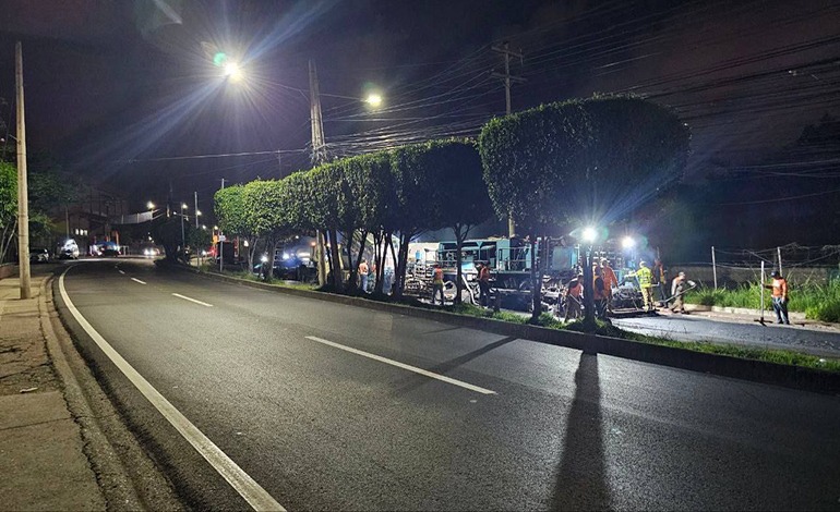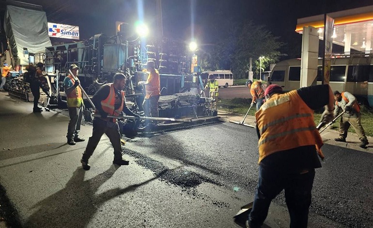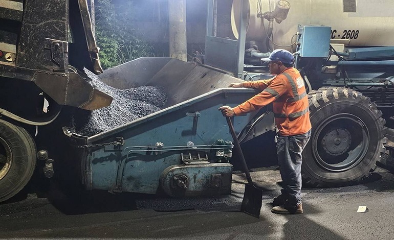 Durante las noches, maquinaria de última generación conocida como “dragones del asfalto” avanza con fuerza en la colocación de nuevas capas de pavimento, permitiendo que los trabajos se realicen sin interrumpir el tráfico diurno.