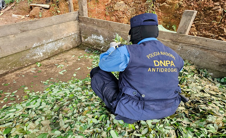 El área intervenida abarca aproximadamente cinco manzanas de tierra, dividida en dos parcelas, con un estimado de 37,500 arbustos de coca de aproximadamente 1.5 metros de altura. La plantación se encontraba en estado de recolección de la hoja de coca para el procesamiento de la pasta base de coca.