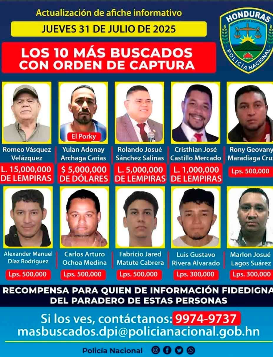 📋 Lista de los más buscados Romeo Vásquez encabeza la lista de los 10 prófugos más buscados del país, que incluye a figuras como Yulan Adonay Archaga Carías (“El Porky”), por quien se ofrece una recompensa de 5 millones de dólares, y Rolando Sánchez Salinas, con 5 millones de lempiras.