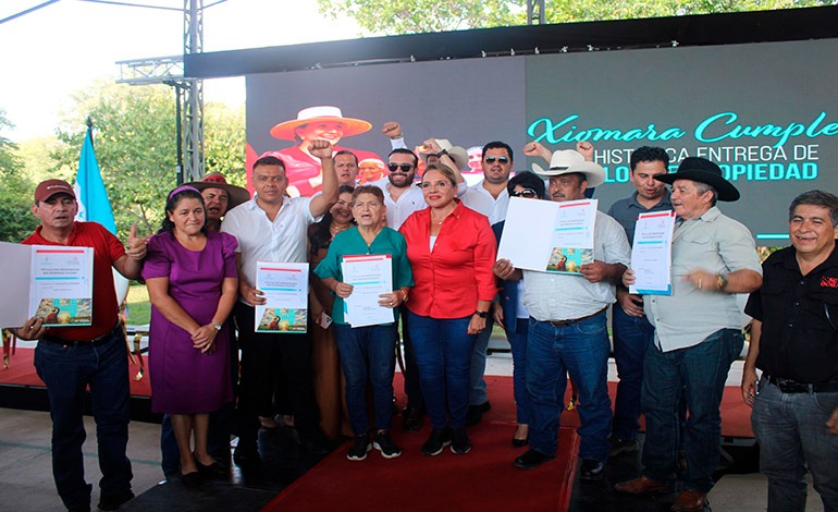 LAS FLORES, Lempira. – La presidenta de la República, Xiomara Castro junto al secretario ejecutivo del Instituto de la Propiedad (IP), Francisco Bocanegra y autoridades locales, encabezó la histórica entrega de títulos a familias de los municipios de Las Flores y Lepaera, Lempira, quienes después de 150 años de espera reciben por fin el dominio pleno de sus tierras.