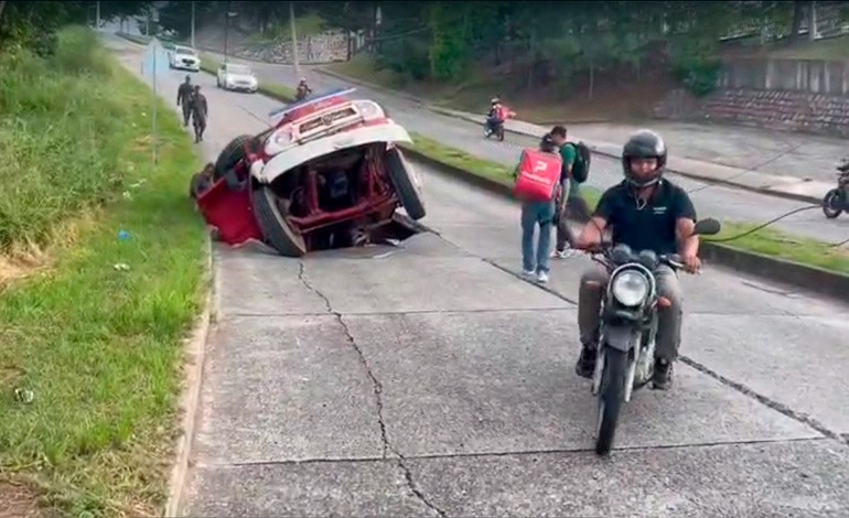 Un enorme socavón prácticamente se tragó una volqueta en la calle principal que da acceso a residencial Venecia, zona suroriental de la capital.