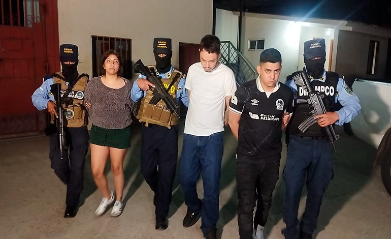 La operación se desarrolló en el sector del bulevar Los Próceres de Tegucigalpa, donde los agentes policiales lograron ubicar y requerir a los sospechosos, quienes fueron identificados como Eduardo José García Ordóñez, de 31 años; Carlos Andrés Aguilar Ayala, de 27 años; y una fémina identificada como Ashley Mariela Rivera Rodríguez, de 24 años.